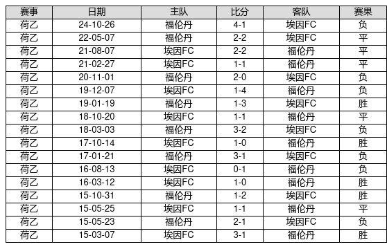 埃因FC VS 福伦丹两队近10年的交战次数为17场,埃因FC5胜5平7负,赢球概率为29.4%,平局概率为29.4%,输球概率为41.2%。