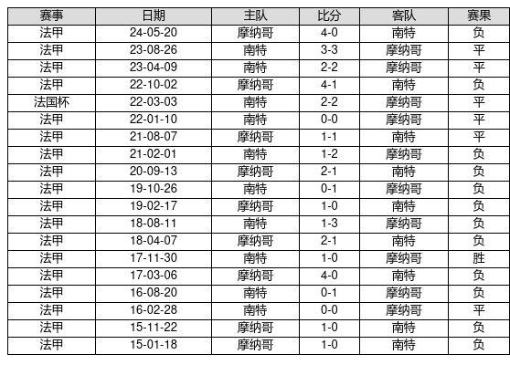 南特 VS 摩纳哥两队近10年的交战次数为19场,南特1胜6平12负,赢球概率为5.3%,平局概率为31.6%,输球概率为63.2%。
