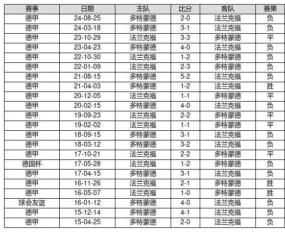 法兰克福 VS 多特蒙德两队近10年的交战次数为22场,法兰克福3胜5平14负,赢球概率为13.6%,平局概率为22.7%,输球概率为63.6%。