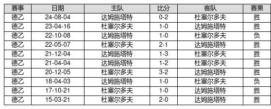 杜塞尔多夫 VS 达姆施塔特两队近10年的交战次数为10场,杜塞尔多夫8胜0平2负,赢球概率为80.0%,平局概率为0.0%,输球概率为20.0%。