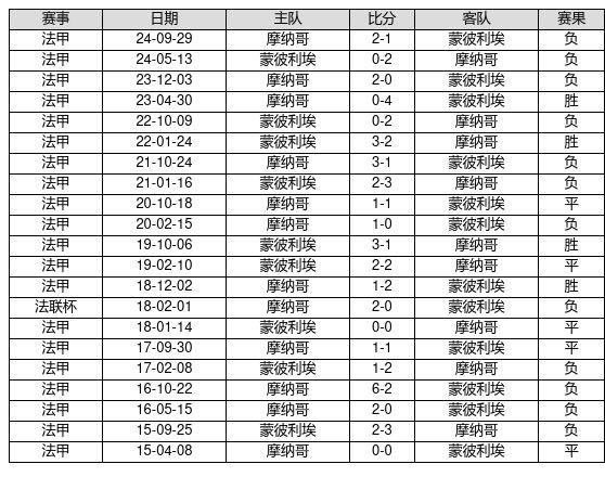 蒙彼利埃 VS 摩纳哥两队近10年的交战次数为21场,蒙彼利埃4胜5平12负,赢球概率为19.0%,平局概率为23.8%,输球概率为57.1%。