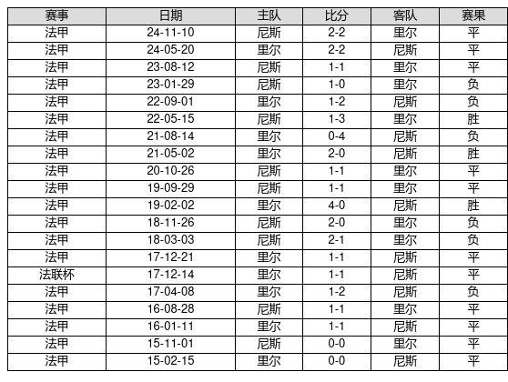 里尔 VS 尼斯两队近10年的交战次数为20场,里尔3胜11平6负,赢球概率为15.0%,平局概率为55.0%,输球概率为30.0%。