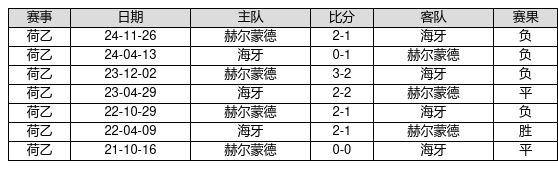 海牙 VS 赫尔蒙德两队近10年的交战次数为7场,海牙1胜2平4负,赢球概率为14.3%,平局概率为28.6%,输球概率为57.1%。