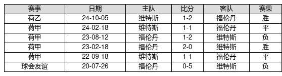 福伦丹 VS 维特斯两队近10年的交战次数为6场,福伦丹2胜2平2负,赢球概率为33.3%,平局概率为33.3%,输球概率为33.3%。