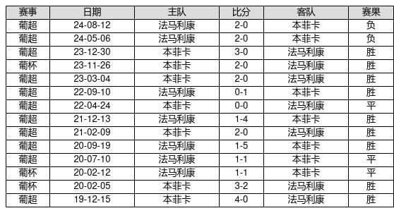本菲卡 VS 法马利康两队近10年的交战次数为14场,本菲卡9胜3平2负,赢球概率为64.3%,平局概率为21.4%,输球概率为14.3%。