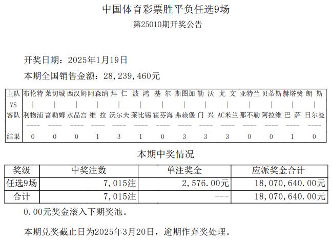 任九开奖北京时间1月19日,足彩第25010期任九开奖结果揭晓。本期任九开出7015注,单注奖金2576元。本期任九投注总额为28,239,666元。