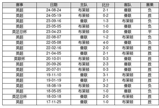 曼联 VS 布莱顿两队近10年的交战次数为18场,曼联10胜1平7负,赢球概率为55.6%,平局概率为5.6%,输球概率为38.9%。