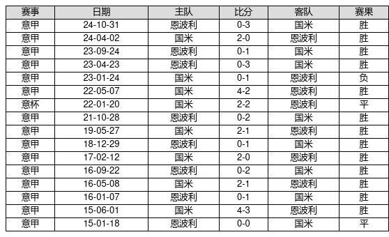 国米 VS 恩波利两队近10年的交战次数为16场,国米13胜2平1负,赢球概率为81.2%,平局概率为12.5%,输球概率为6.2%。