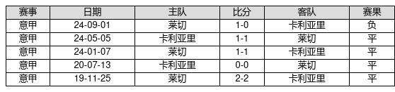 卡利亚里 VS 莱切两队近10年的交战次数为5场,卡利亚里0胜4平1负,赢球概率为0.0%,平局概率为80.0%,输球概率为20.0%。