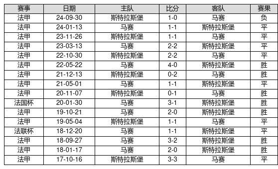 马赛 VS 斯特拉斯堡两队近10年的交战次数为16场,马赛7胜8平1负,赢球概率为43.8%,平局概率为50.0%,输球概率为6.2%。