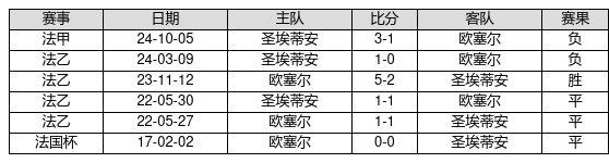 欧塞尔 VS 圣埃蒂安两队近10年的交战次数为6场,欧塞尔1胜3平2负,赢球概率为16.7%,平局概率为50.0%,输球概率为33.3%。