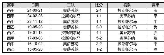 拉斯帕尔马 VS 奥萨苏纳两队近10年的交战次数为8场,拉斯帕尔马3胜3平2负,赢球概率为37.5%,平局概率为37.5%,输球概率为25.0%。