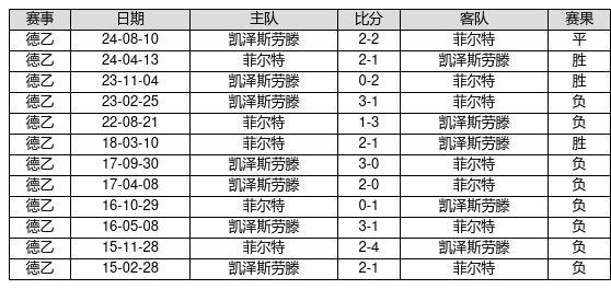 菲尔特 VS 凯泽斯劳滕两队近10年的交战次数为12场,菲尔特3胜1平8负,赢球概率为25.0%,平局概率为8.3%,输球概率为66.7%。