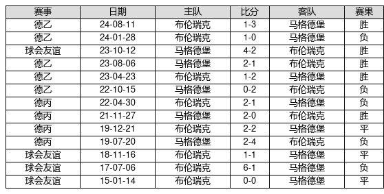 马格德堡 VS 布伦瑞克两队近10年的交战次数为13场,马格德堡5胜3平5负,赢球概率为38.5%,平局概率为23.1%,输球概率为38.5%。