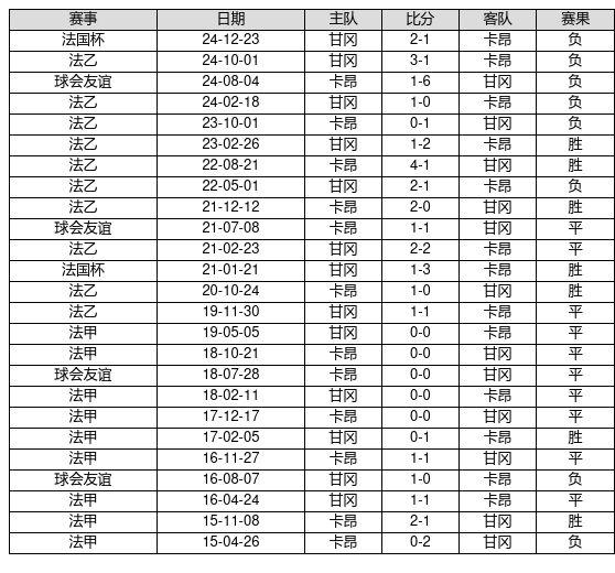 卡昂 VS 甘冈两队近10年的交战次数为25场,卡昂7胜10平8负,赢球概率为28.0%,平局概率为40.0%,输球概率为32.0%。