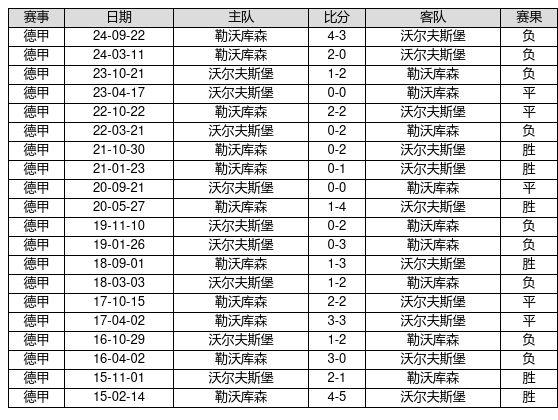 沃尔夫斯堡 VS 勒沃库森两队近10年的交战次数为20场,沃尔夫斯堡6胜5平9负,赢球概率为30.0%,平局概率为25.0%,输球概率为45.0%。