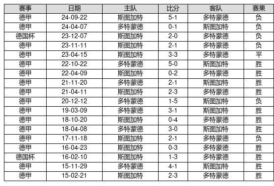 多特蒙德 VS 斯图加特两队近10年的交战次数为18场,多特蒙德11胜1平6负,赢球概率为61.1%,平局概率为5.6%,输球概率为33.3%。