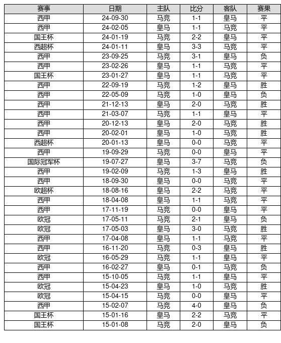 皇马 VS 马竞两队近10年的交战次数为33场,皇马8胜18平7负,赢球概率为24.2%,平局概率为54.5%,输球概率为21.2%。