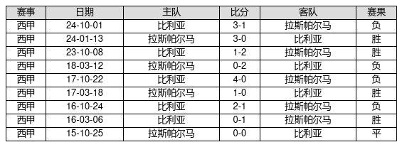 拉斯帕尔马 VS 比利亚两队近10年的交战次数为9场,拉斯帕尔马4胜1平4负,赢球概率为44.4%,平局概率为11.1%,输球概率为44.4%。