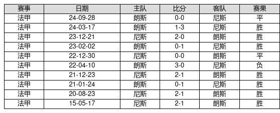 尼斯 VS 朗斯两队近10年的交战次数为10场,尼斯7胜2平1负,赢球概率为70.0%,平局概率为20.0%,输球概率为10.0%。