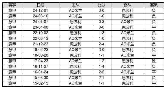 恩波利 VS AC米兰两队近10年的交战次数为14场,恩波利1胜4平9负,赢球概率为7.1%,平局概率为28.6%,输球概率为64.3%。