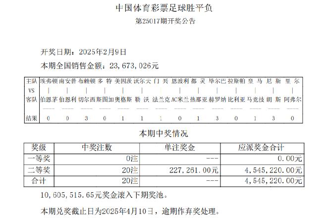 皇马1-1马竞北京时间2月9日,胜负彩第25017期开奖结果揭晓。本期一等奖空开,滚存10,605,515.65元。二等奖开20注227,261元;任九开115注119,422元。本期胜负彩销量为23,673,026元,任九投注总额为21,458,694元。