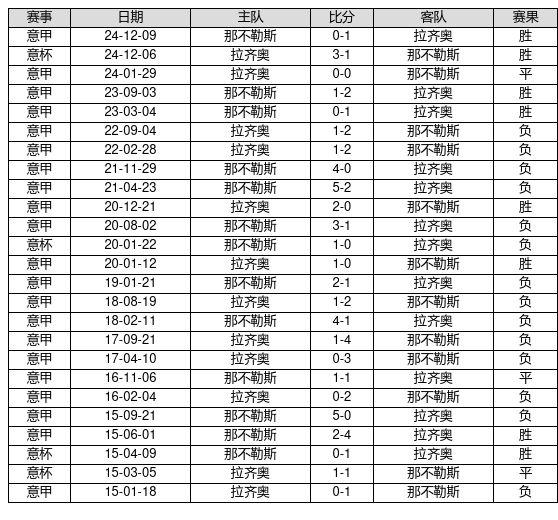 拉齐奥 VS 那不勒斯两队近10年的交战次数为25场,拉齐奥8胜3平14负,赢球概率为32.0%,平局概率为12.0%,输球概率为56.0%。