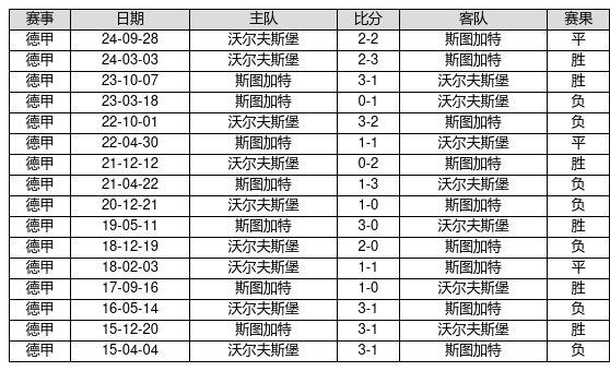 斯图加特 VS 沃尔夫斯堡两队近10年的交战次数为16场,斯图加特6胜3平7负,赢球概率为37.5%,平局概率为18.8%,输球概率为43.8%。