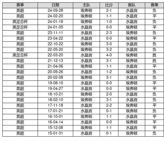 水晶宫 VS 埃弗顿两队近10年的交战次数为23场,水晶宫2胜10平11负,赢球概率为8.7%,平局概率为43.5%,输球概率为47.8%。