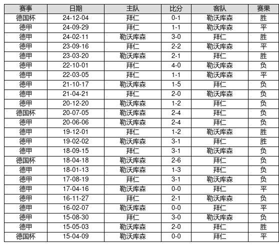 勒沃库森 VS 拜仁两队近10年的交战次数为24场,勒沃库森6胜6平12负,赢球概率为25.0%,平局概率为25.0%,输球概率为50.0%。