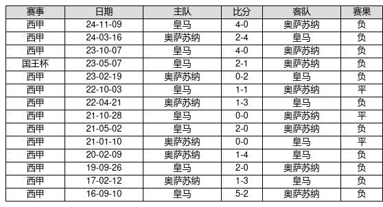 奥萨苏纳 VS 皇马两队近10年的交战次数为14场,奥萨苏纳0胜3平11负,赢球概率为0.0%,平局概率为21.4%,输球概率为78.6%。