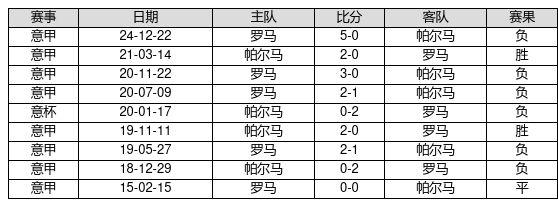 帕尔马 VS 罗马两队近10年的交战次数为9场,帕尔马2胜1平6负,赢球概率为22.2%,平局概率为11.1%,输球概率为66.7%。