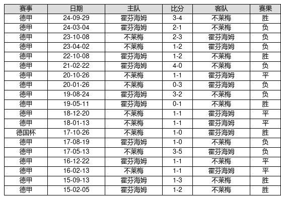 不莱梅 VS 霍芬海姆两队近10年的交战次数为19场,不莱梅6胜5平8负,赢球概率为31.6%,平局概率为26.3%,输球概率为42.1%。