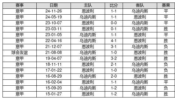 乌迪内斯 VS 恩波利两队近10年的交战次数为15场,乌迪内斯6胜5平4负,赢球概率为40.0%,平局概率为33.3%,输球概率为26.7%。