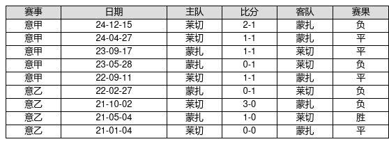 蒙扎 VS 莱切两队近10年的交战次数为9场,蒙扎1胜4平4负,赢球概率为11.1%,平局概率为44.4%,输球概率为44.4%。