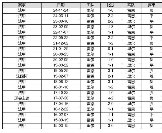 雷恩 VS 里尔两队近10年的交战次数为22场,雷恩5胜9平8负,赢球概率为22.7%,平局概率为40.9%,输球概率为36.4%。