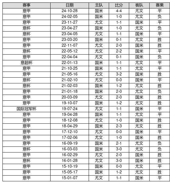 尤文 VS 国米两队近10年的交战次数为30场,尤文12胜12平6负,赢球概率为40.0%,平局概率为40.0%,输球概率为20.0%。