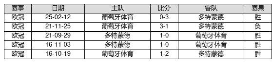 多特蒙德 VS 葡萄牙体育两队近10年的交战次数为5场,多特蒙德4胜0平1负,赢球概率为80.0%,平局概率为0.0%,输球概率为20.0%。