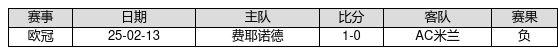 AC米兰 VS 费耶诺德两队近10年的交战次数为1场,AC米兰0胜0平1负,赢球概率为0.0%,平局概率为0.0%,输球概率为100.0%。