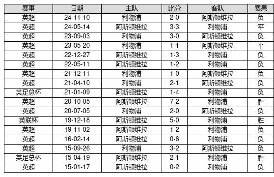 阿斯顿维拉 VS 利物浦两队近10年的交战次数为17场,阿斯顿维拉3胜2平12负,赢球概率为17.6%,平局概率为11.8%,输球概率为70.6%。
