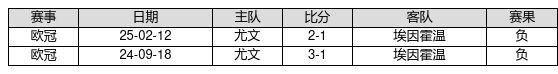 埃因霍温 VS 尤文两队近10年的交战次数为2场,埃因霍温0胜0平2负,赢球概率为0.0%,平局概率为0.0%,输球概率为100.0%。