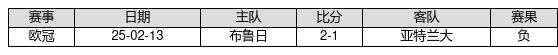 亚特兰大 VS 布鲁日两队近10年的交战次数为1场,亚特兰大0胜0平1负,赢球概率为0.0%,平局概率为0.0%,输球概率为100.0%。