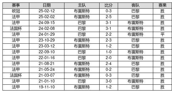 巴黎 VS 布雷斯特两队近10年的交战次数为14场,巴黎13胜1平0负,赢球概率为92.9%,平局概率为7.1%,输球概率为0.0%。