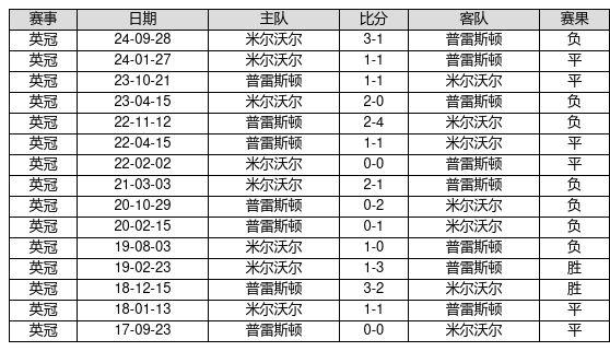 普雷斯顿 VS 米尔沃尔两队近10年的交战次数为15场,普雷斯顿2胜6平7负,赢球概率为13.3%,平局概率为40.0%,输球概率为46.7%。