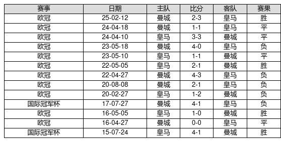 皇马 VS 曼城两队近10年的交战次数为13场,皇马4胜4平5负,赢球概率为30.8%,平局概率为30.8%,输球概率为38.5%。