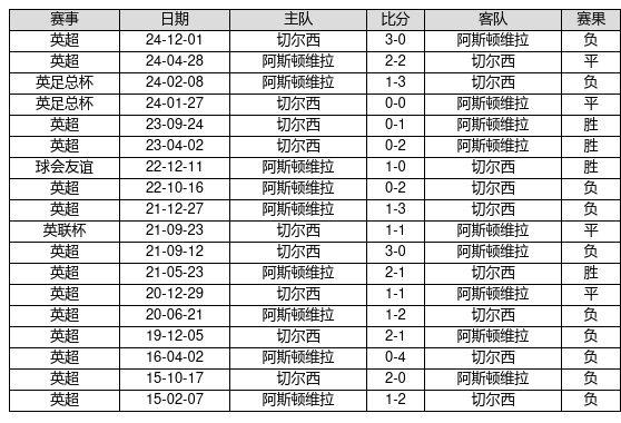 阿斯顿维拉 VS 切尔西两队近10年的交战次数为18场,阿斯顿维拉4胜4平10负,赢球概率为22.2%,平局概率为22.2%,输球概率为55.6%。