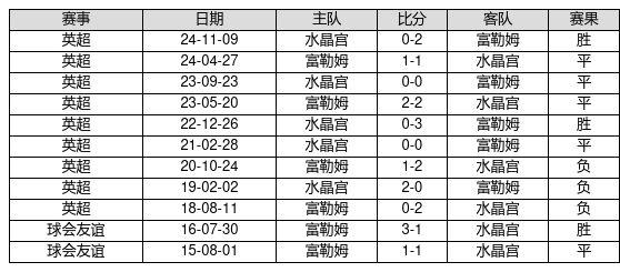 富勒姆 VS 水晶宫两队近10年的交战次数为11场,富勒姆3胜5平3负,赢球概率为27.3%,平局概率为45.5%,输球概率为27.3%。