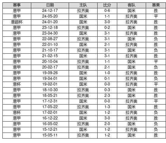 国米 VS 拉齐奥两队近10年的交战次数为23场,国米12胜4平7负,赢球概率为52.2%,平局概率为17.4%,输球概率为30.4%。