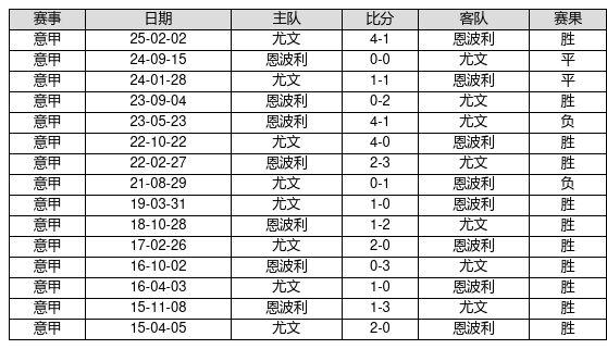 尤文 VS 恩波利两队近10年的交战次数为15场,尤文11胜2平2负,赢球概率为73.3%,平局概率为13.3%,输球概率为13.3%。