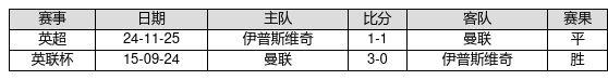 曼联 VS 伊普斯维奇两队近10年的交战次数为2场,曼联1胜1平0负,赢球概率为50.0%,平局概率为50.0%,输球概率为0.0%。